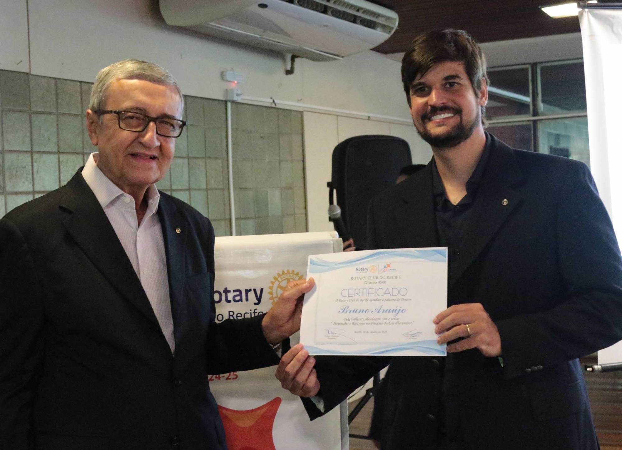 O Rotary Club do Recife recebeu com grande entusiasmo o médico Geriatra Dr. Bruno Araújo, que ministrou uma excelente palestra sobre Prevenções e Rastreios no Processo do Envelhecimento.
